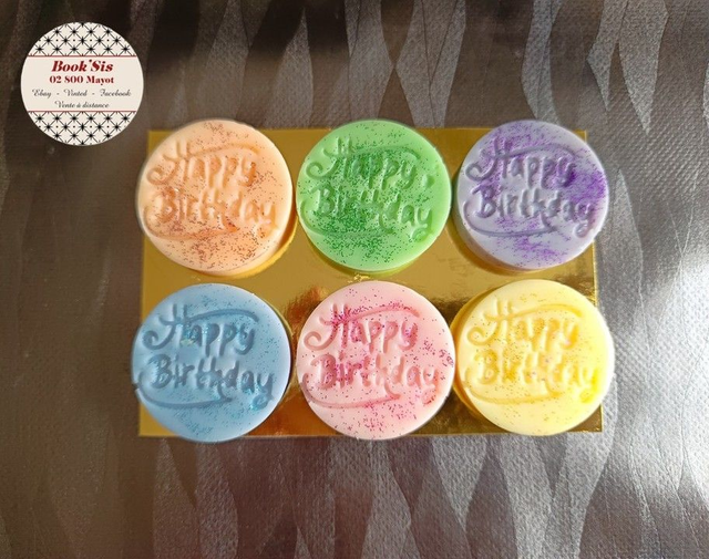 Les parfums : Vanille ( orange ), Happy birthday ( vert ), Surprise ( violet ), Fleur de coton ( bleu ), Cerise noire explosive ( rose ), Monoï ( jaune ).