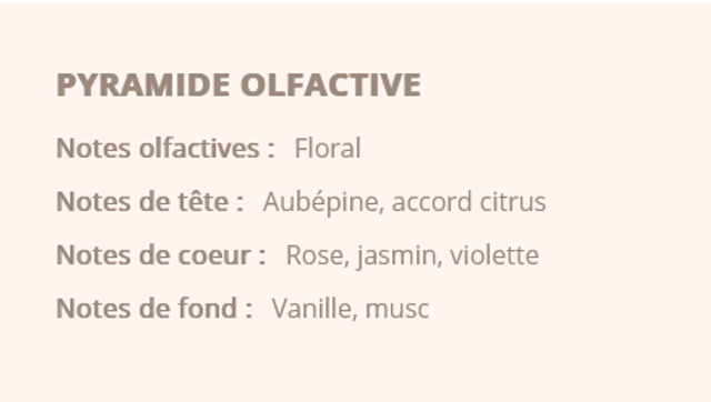 Contient : Acetate Linalyle, Aldehyde Hexyl Cinnamique, Citronellol, Geraniol, Hydroxycitronellal, Linalol, Methylionone Gamma, Octine Carbonate Methyle.
