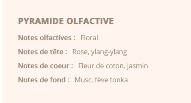 Contient : Acetate PTBCH, Aldehyde Hexyl Cinnamique, Coumarine, Linalol, Methylionone Gamma.
