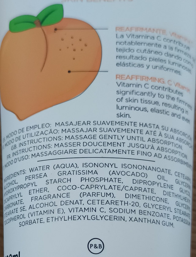 Elle est enrichie en Vitamine C, un puissant antioxydant connu pour ses propriétés raffermissantes et régénérantes.